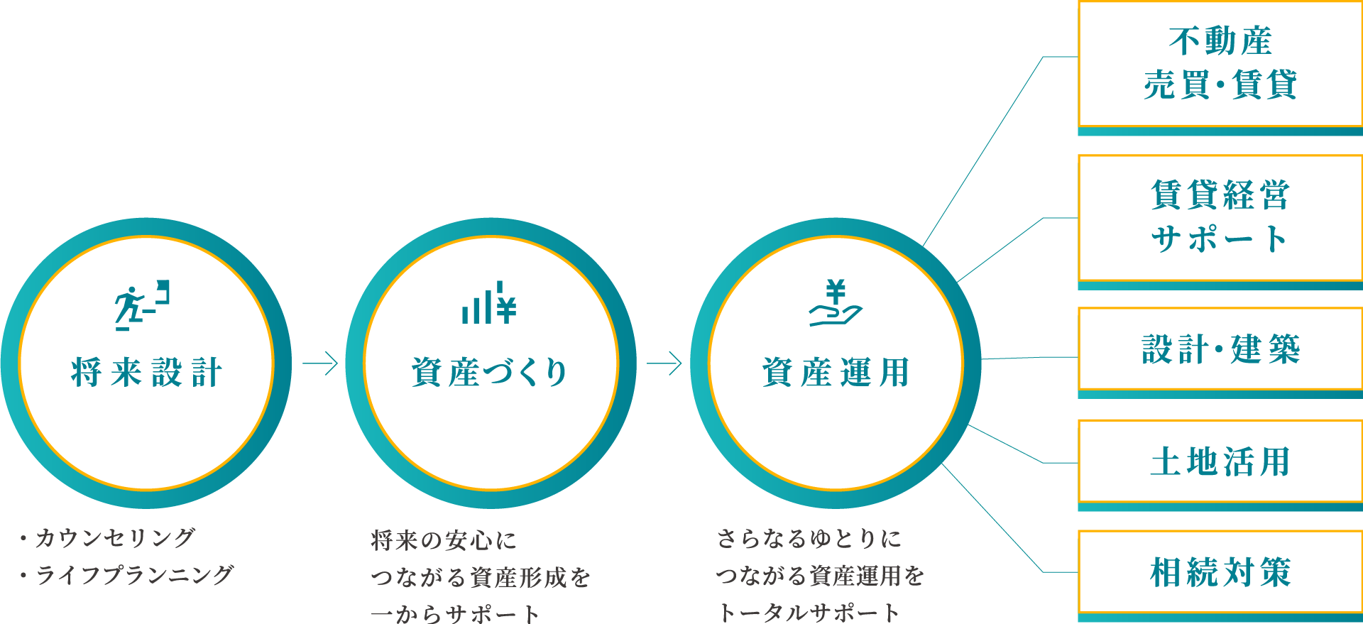 資産運用のトータルサポート全国に事業を展開するグループ力を活かして、不動産を活用した総合的な資産運用のサポートを行っています。土地や建物の取得から建設、管理のサポートまで一貫してグループ内で手がけることで、中間マージンなどの無駄な経費をカットするとともに、連携力を発揮して品質の高い建築とサポートをご提供。お客様の大切な資産の有効活用を支えています。